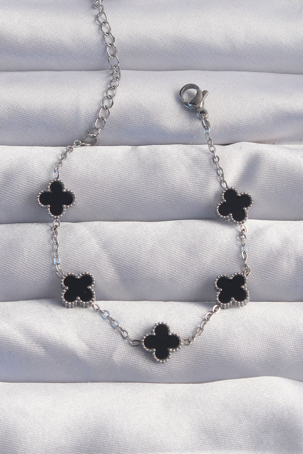 316L Çelik Baby Boy Gümüş Renk Siyah Mineli Yonca Bileklik