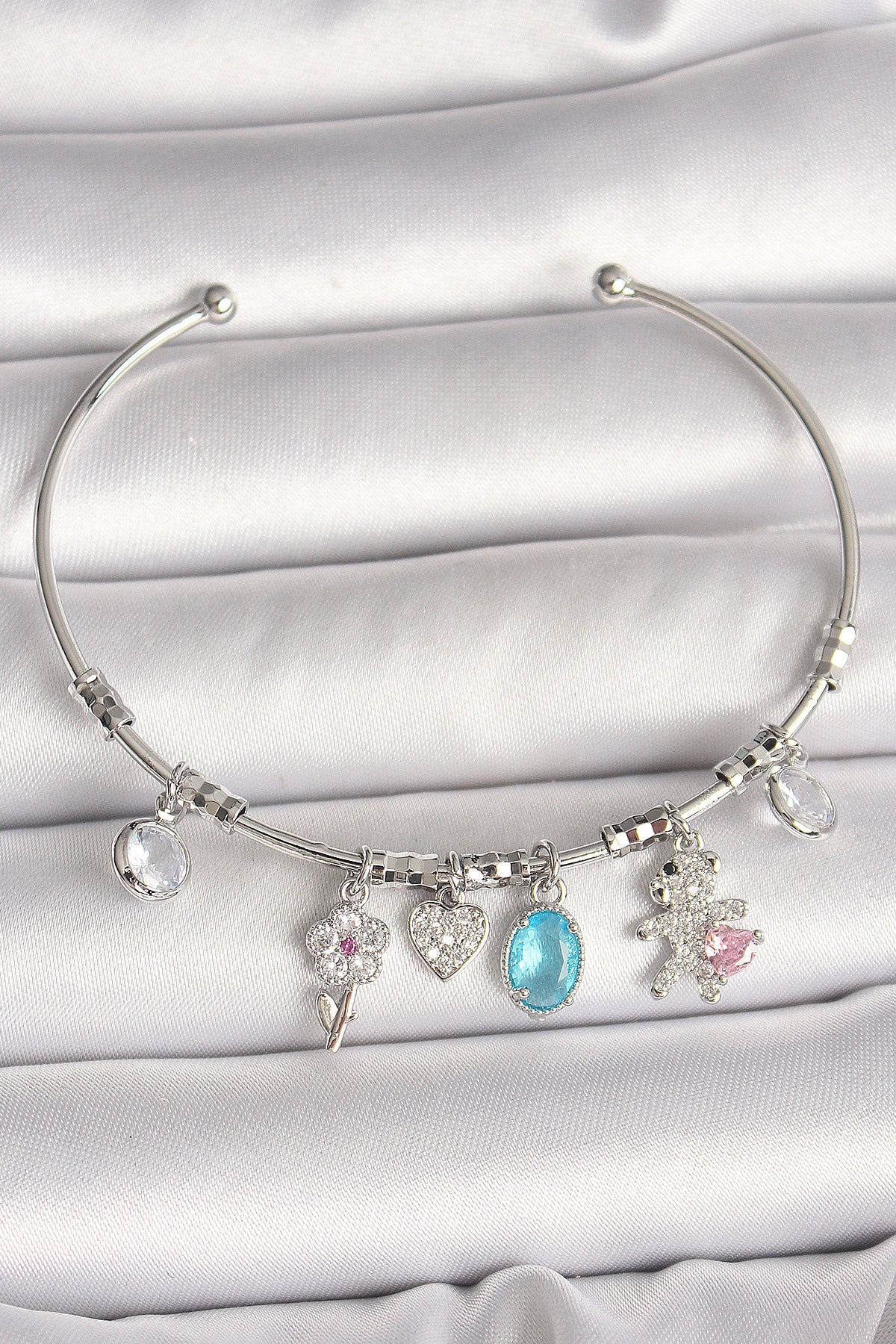 Pirinç Gümüş Renk Sallantı Zirkon Taşlı Ayıcık Figür Çiçek Detay Charm Kadın Bileklik