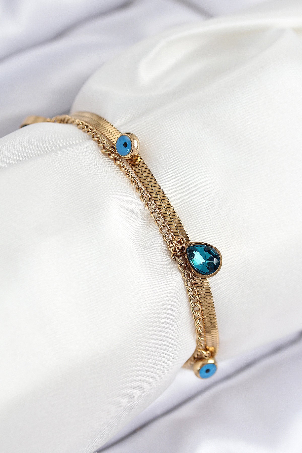 316L Çelik Nazar Boncuk Detaylı Mavi Zirkon Taşlı Model İtalyan Zincir Gold Renk Kadın Bileklik