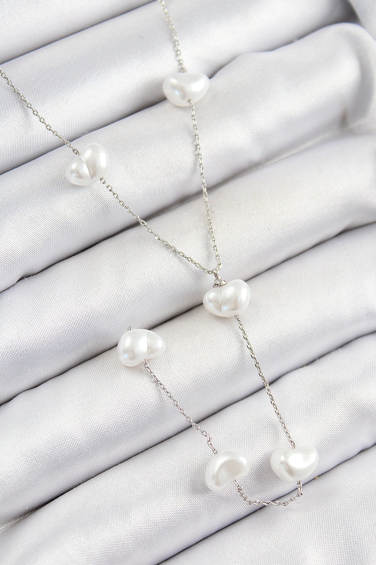 Pirinç İncili Kalp Figürlü Y Model Gümüş Renk Kadın Kolye