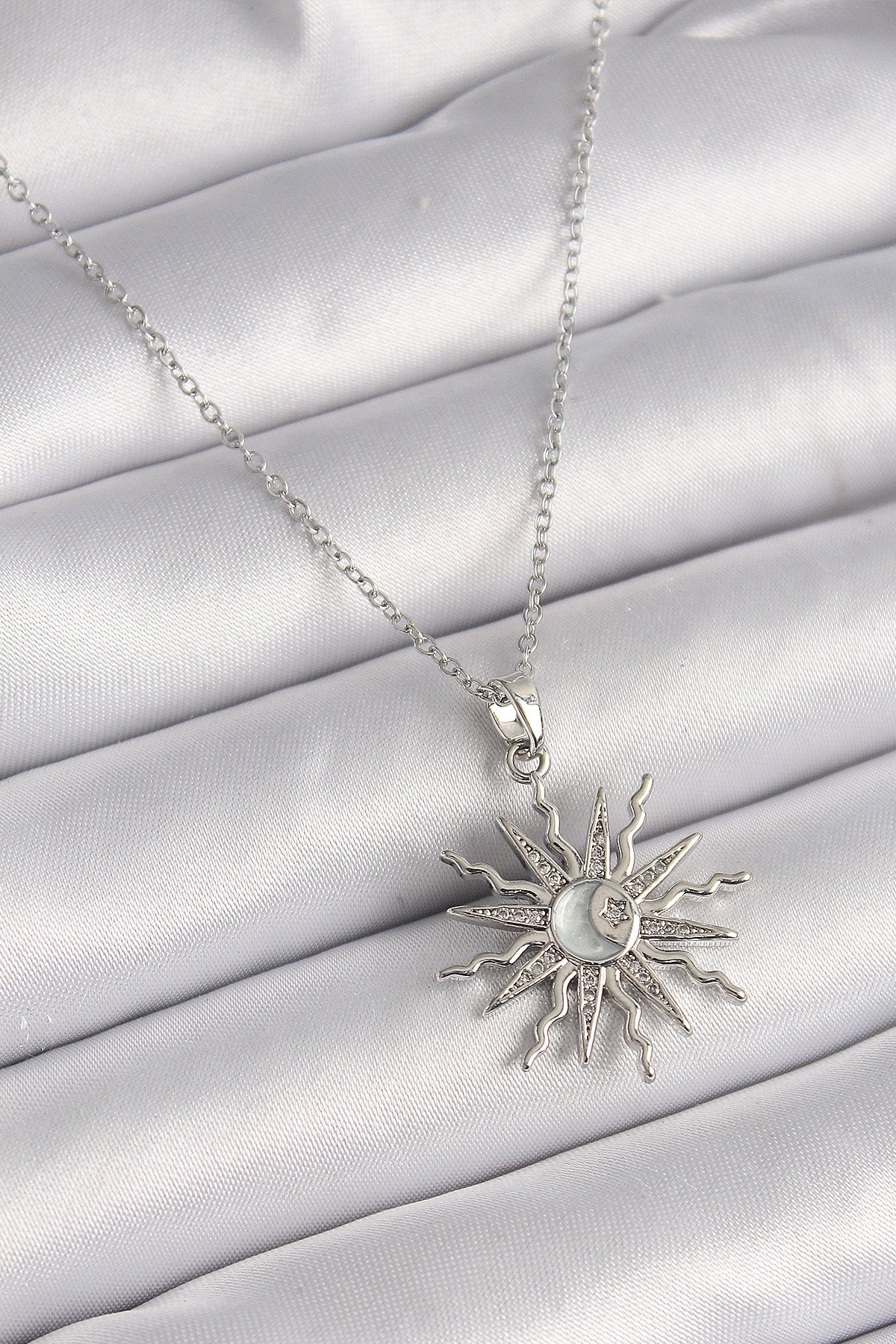 316L Çelik Gümüş Renk Zincir Zirkon Taşlı Güneş Model Sedefli Ay İşleme Detay Kadın Kolye