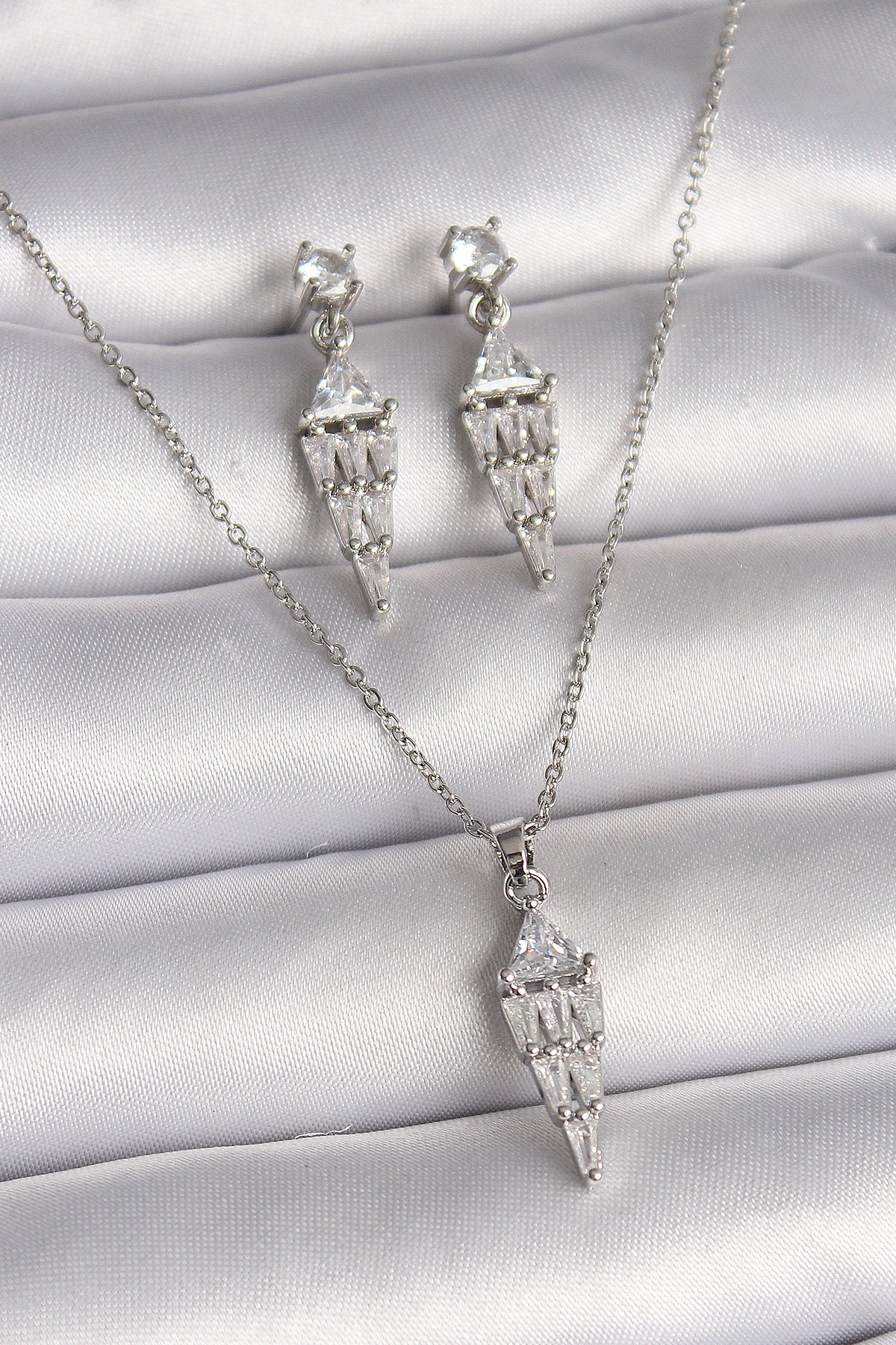 316L Çelik Gümüş Renk Zincir Sallantı Zirkon Taş Model Kadın Kolye Küpe Seti