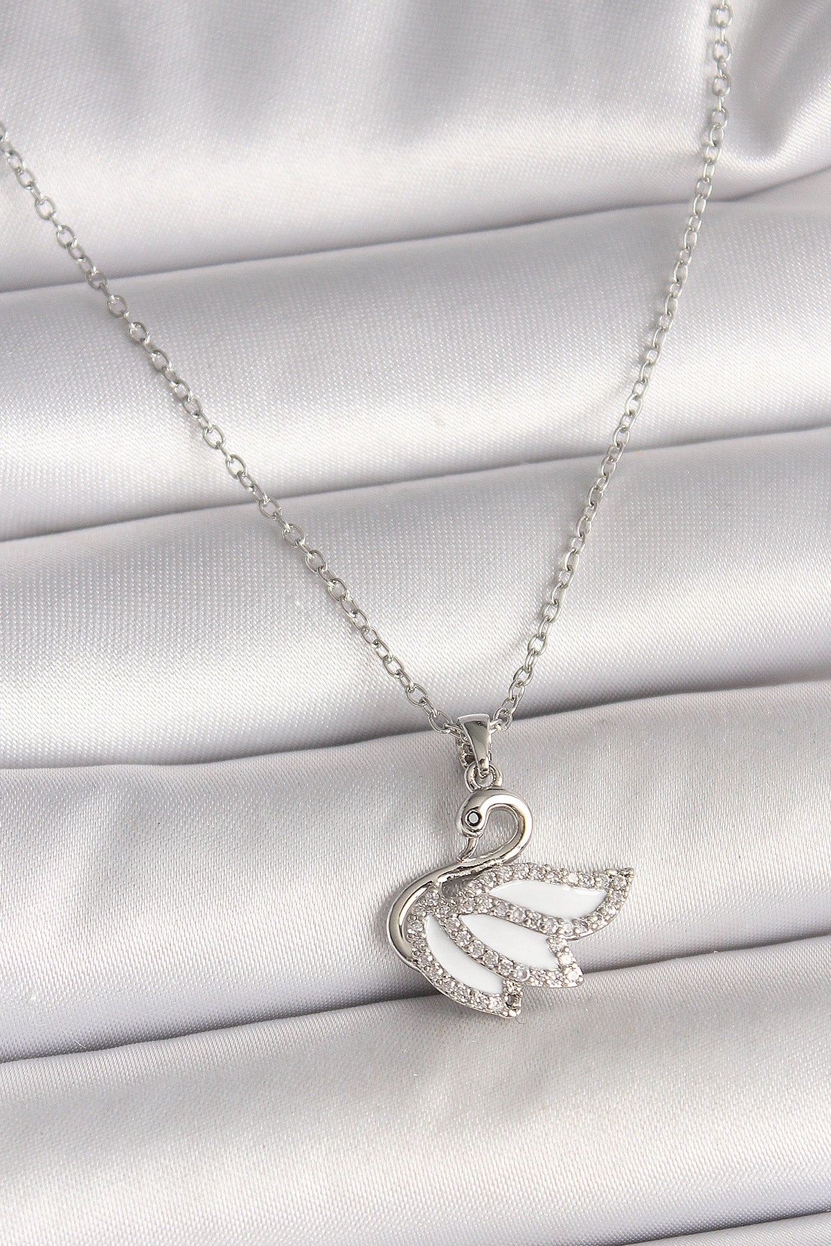 316L Çelik Gümüş Renk Zincir Zirkon Taşlı Kuğu Model Kadın Kolye