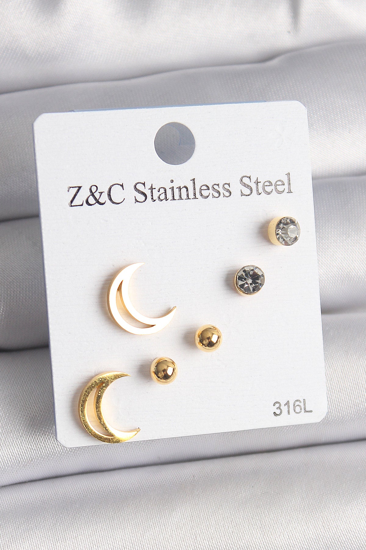 316L Çelik Gold Renk Zirkon Taşlı Hilal Model Kadın Küpe Seti