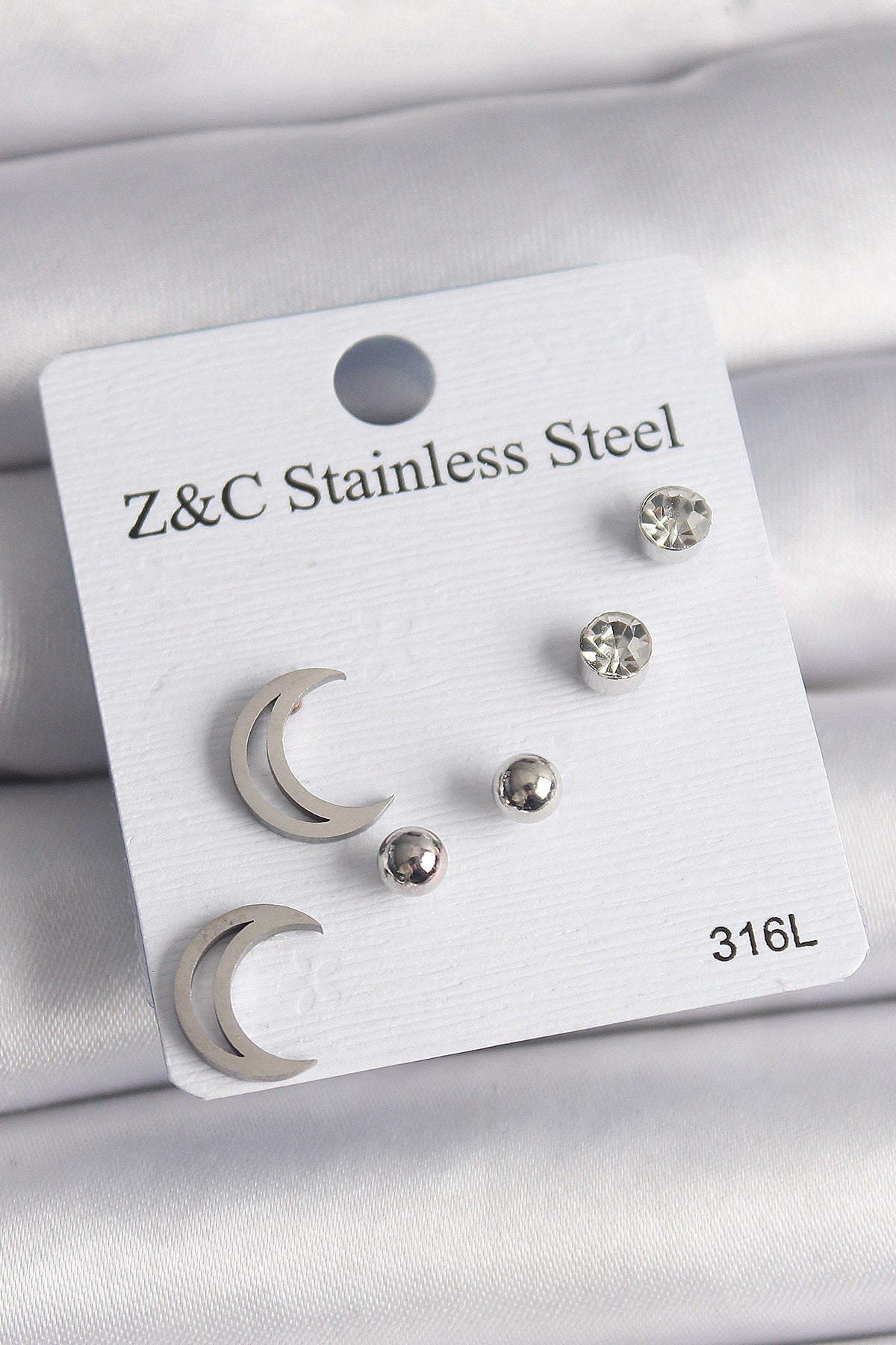 316L Çelik Gümüş Renk Zirkon Taşlı Hilal Model Kadın Küpe Seti
