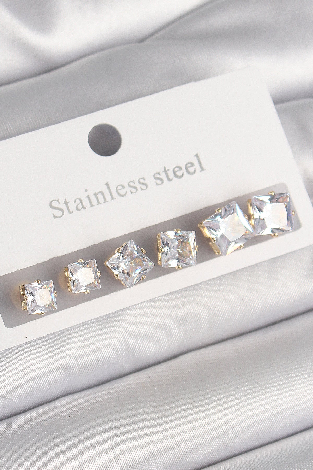 316L Çelik Gold Renk Kare Zirkon Taş Model Kadın Küpe Seti