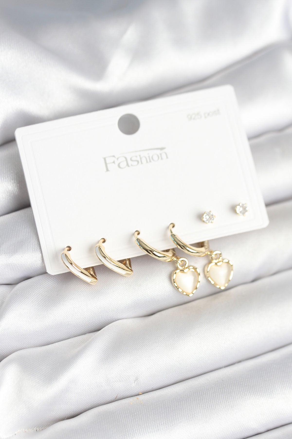 Pirinç Gold Renk Kalp Detaylı 925 Ayar Gümüş Çivili Kadın Küpe Seti