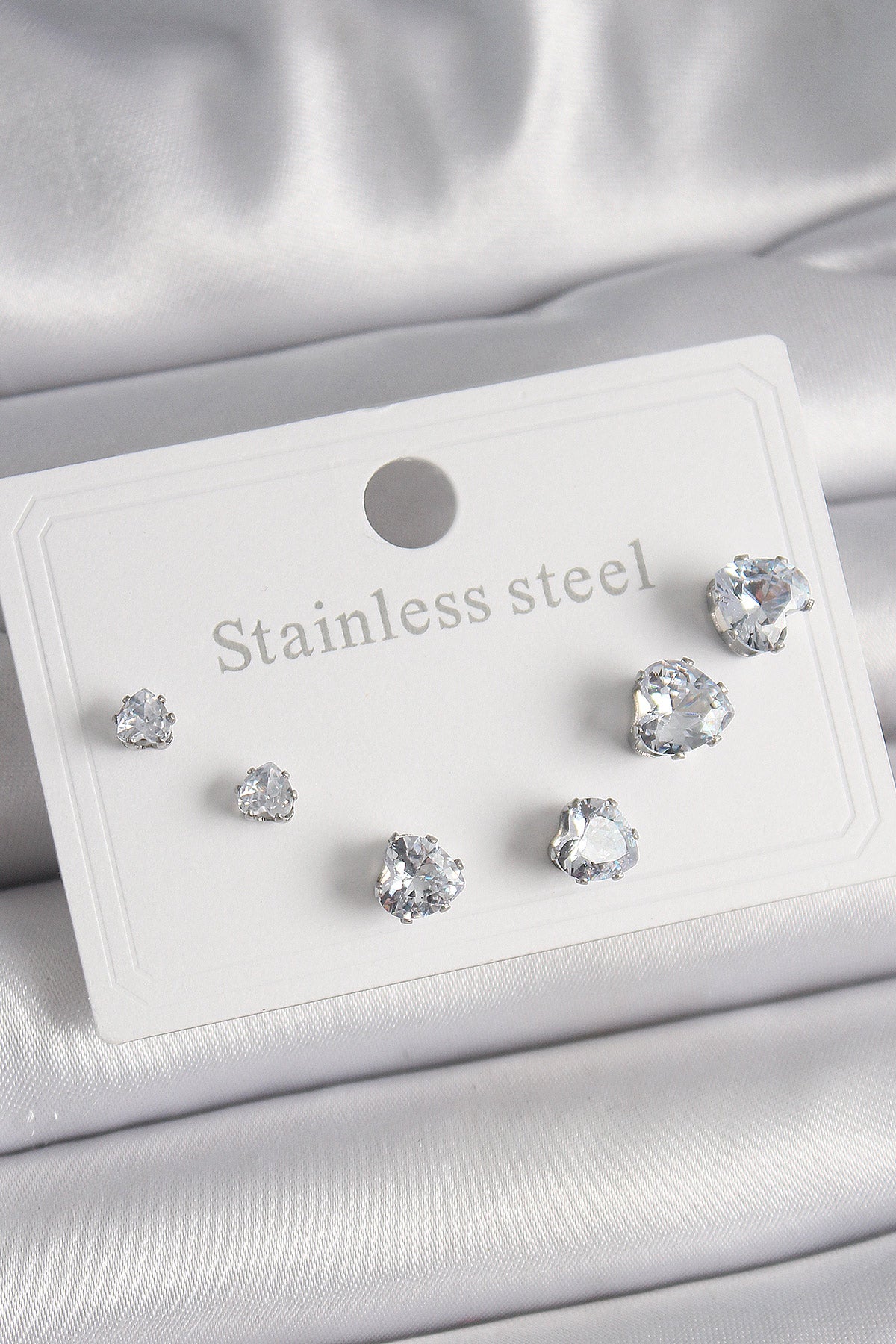 316L Çelik Gümüş Renk Zirkon Taşlı Kalp Model Kadın Küpe Seti