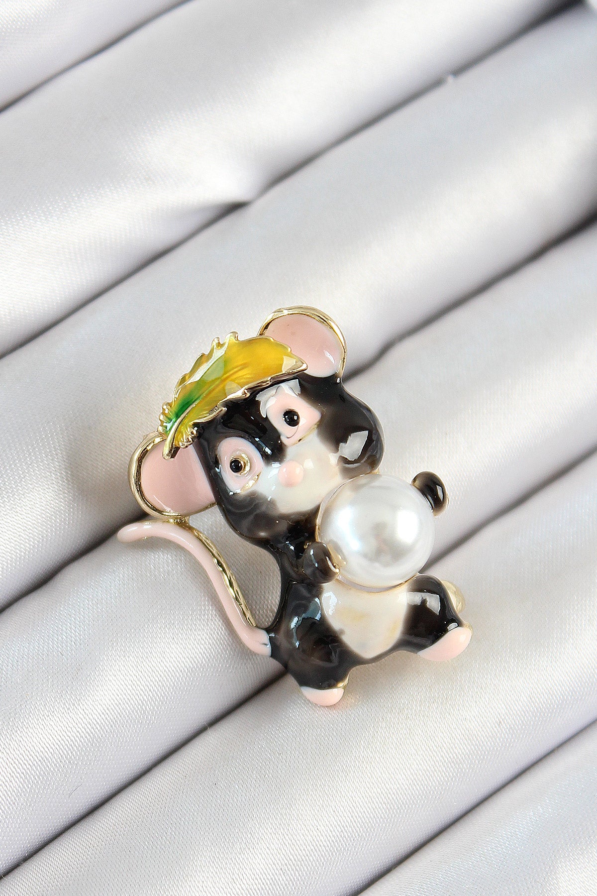İnci Detaylı Siyah Ve Pembe 3D Sevimli Fare Figürlü Gold Renk Kadın Broş