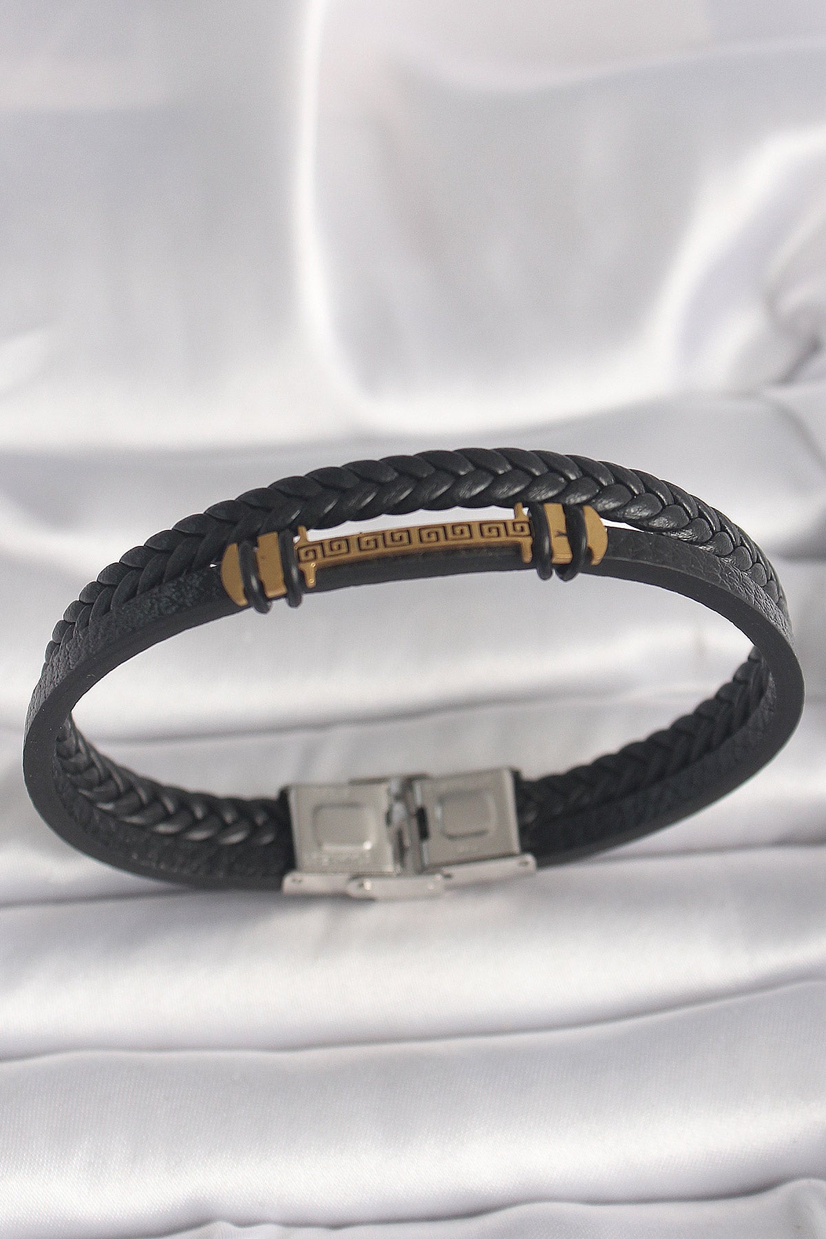 316L Çelik Gold Renk ZikZak İşlemeli Aksesuarlı Çift Sıra Burgu Desenli Deri Kordon Erkek Bileklik